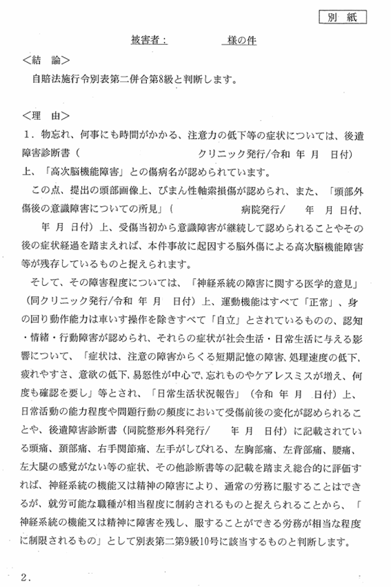 後遺障害等級認定結果…高次脳機能障害は後遺障害9級10号の認定