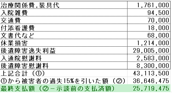 こちらからの請求に対し、相手方任意保険会社からは入通院慰謝料だけが約25万円ほど低い回答でしたが、その他の費目はすべて当方からの請求金額に応じる回答でした。